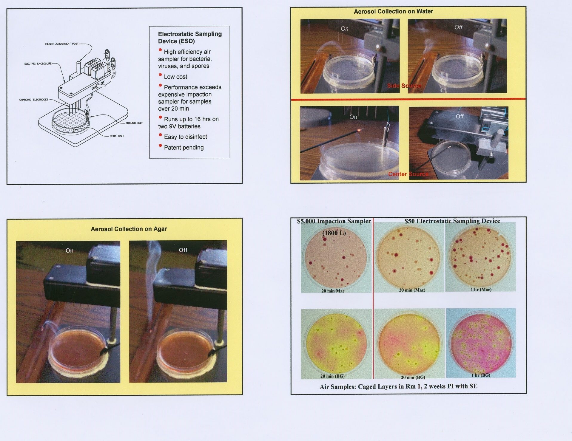 Previous devices with good to high efficiency recovery were typically large and bulky, difficult to disinfect, or expensive -- ranging in price from $1,000 up to $25,000 each. Duplicated tests with the ESD for sampling of total and pathogenic bacteria at a poultry house exhaust outlet as well as in a caged layer room with birds infected with Salmonella enteritidis have shown up to 20 fold improvements compared to standard settling plates and better performance than a well known and widely used medium volume, laboratory-grade, portable impaction sampler costing approximately 100 times as much. Preliminary ESD tests with naturally generated viruses have shown that samples transferred to an RT-PCR allowed for consistent virus identification. Performance tests suggest the ESD -- if operated for 2 hours or more can provide the equivalent of a High Volume Air Sampler, and it can be operated for about 16 hours with two standard 9-Volt batteries. The ESD size makes it easy to transport and convenient to place in various locations throughout a space. Its low cost and simplicity would make it practical for routine use by hygienists, microbiologists, technicians, etc. The ESD can easily be configured for use with liquid media or metal collectors such that samples can be transferred to RT-PCR for rapid diagnosis of specific organisms (such as pathogenic strains of influenza). The potential market for the ESD should be world wide with applications ranging from routine monitoring of poultry and livestock to epidemiology, to processing areas, hospitals, monitoring of public areas for potential bioterrorism attack, and routine air quality surveys in office areas, schools, etc. Several ESD units have been loaned to various laboratories, research units, and companies for field evaluation. The ESD is patented (U.S. Patent No. 7,046,011 issued May 16, 2006) but licensing is no longer required.